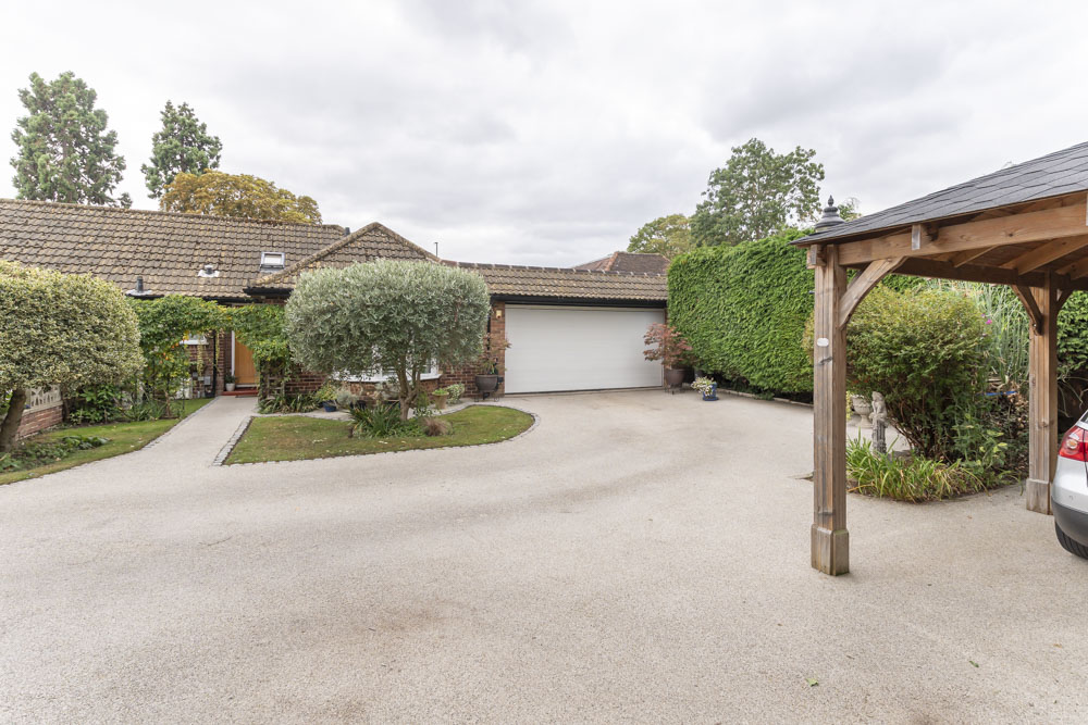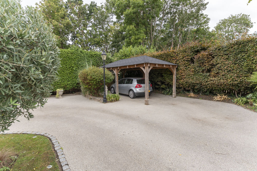 Front garden laid to shrubs with resin driveway providing parking for a number of cars and single car port. Pathway to front door.