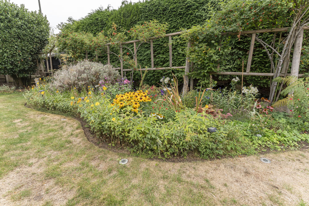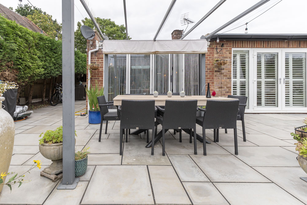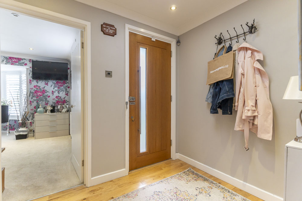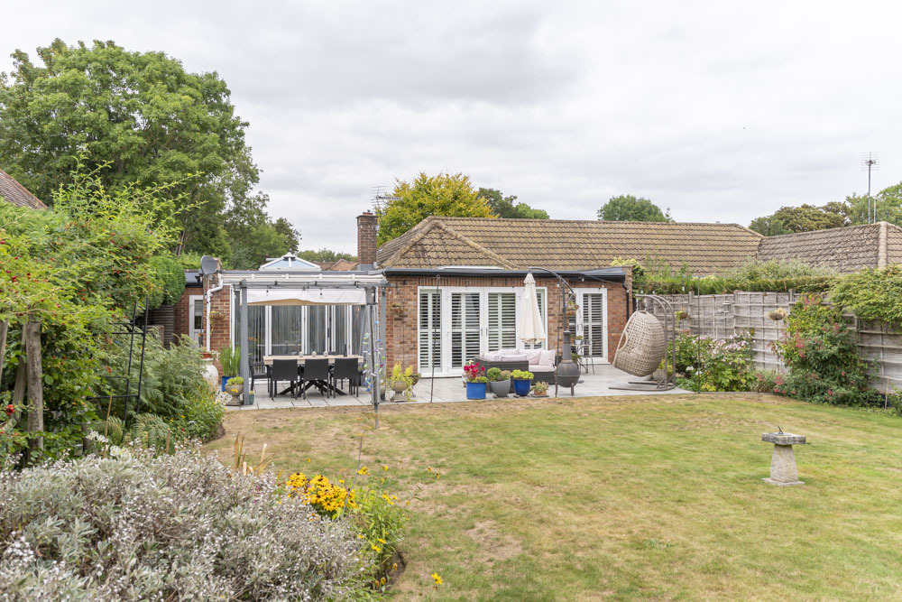 Stepping out from master bedroom, kitchen and living room onto south facing patio and lawn with well stocked flower and shrub borders. Coniferous screening to rear with pathway leading to pedestrian rear access.