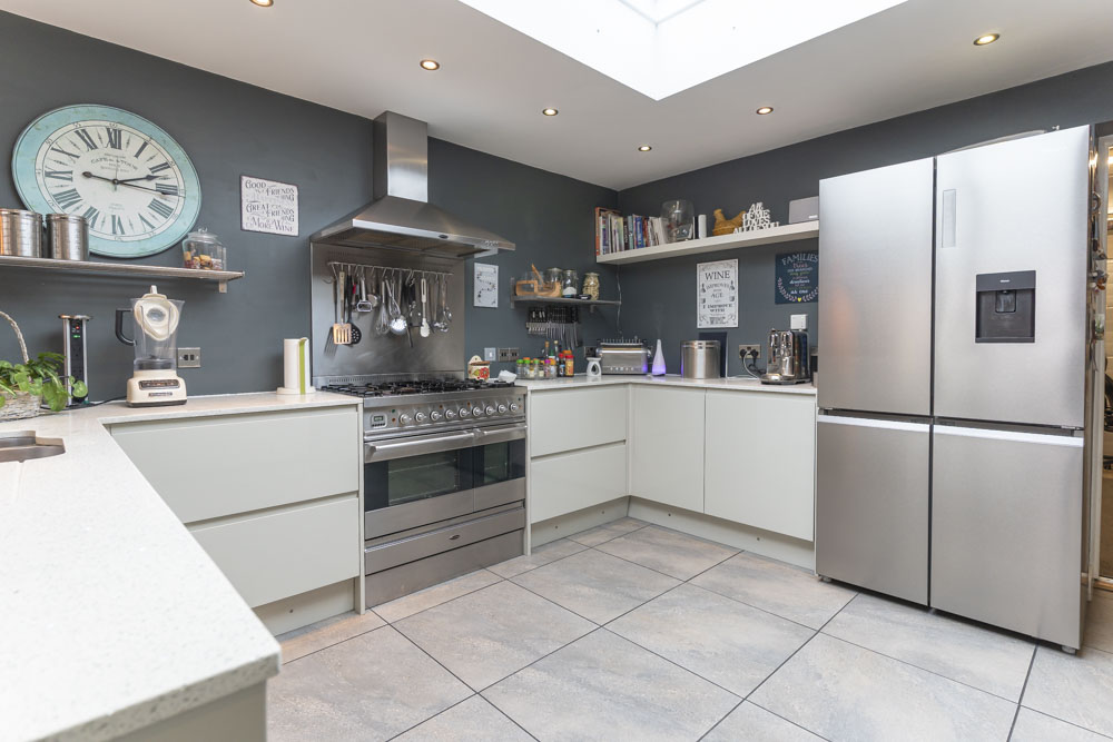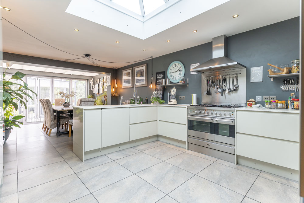 With a modern range of bas and eye level units and granite work surfaces with electric ‘range’ style ovens with gas cooktop. Fitted integrated dishwasher and tiled flooring with bi-folding doors to the south facing rear garden. Ceiling lantern and integral door to garage.