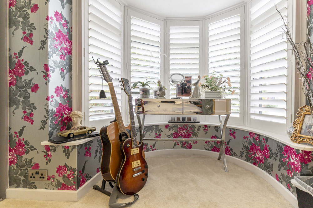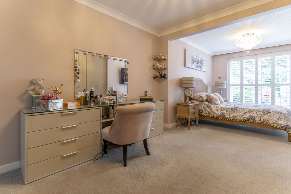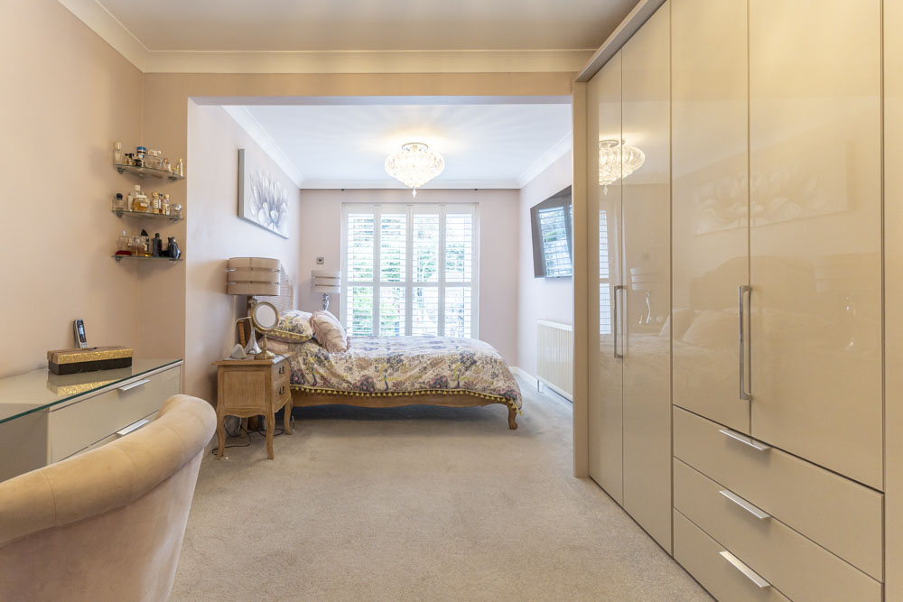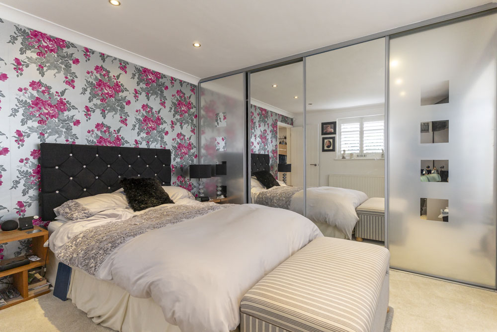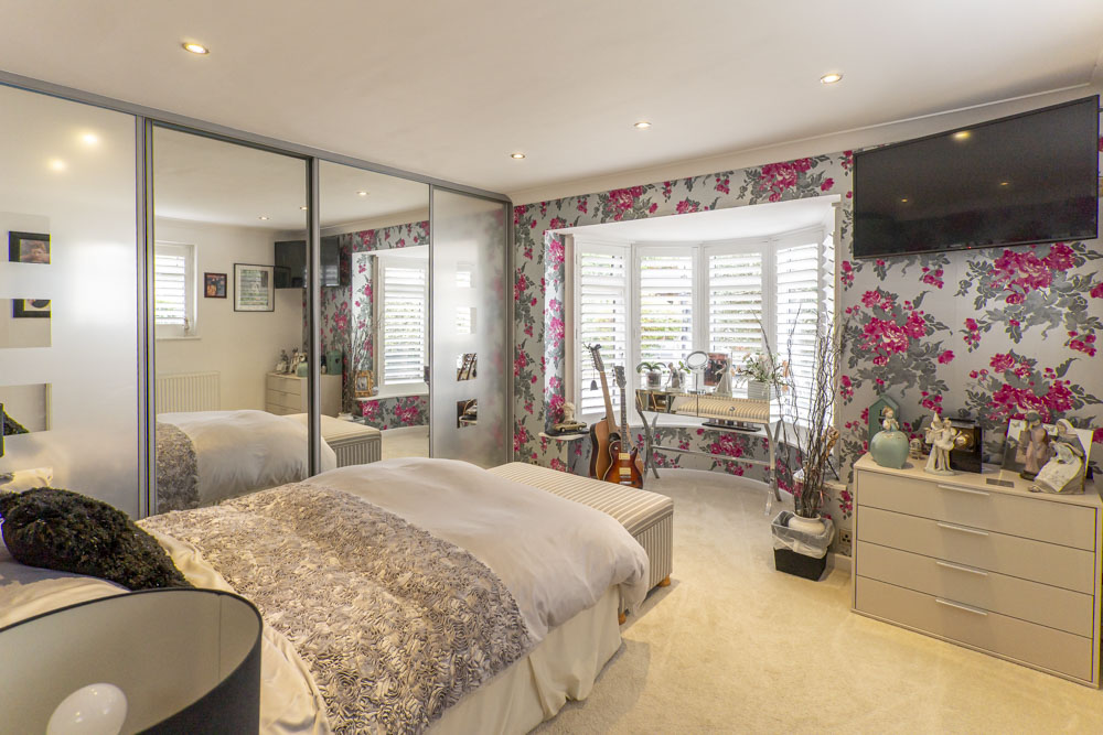 Front aspect double bedroom with bay window and further window to side, each with plantation shutters. Range of fitted wardrobes.
