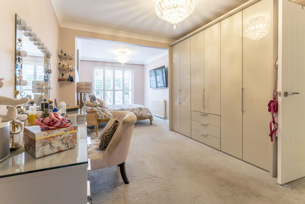 Stylishly arranged with casement doors with plantation shutters to rear garden, dressing area with range of fitted wardrobes and panelled door to En-Suite Shower Room with fully tiled shower cubicle with glass screen, WC and wash hand basin. Front aspect.
