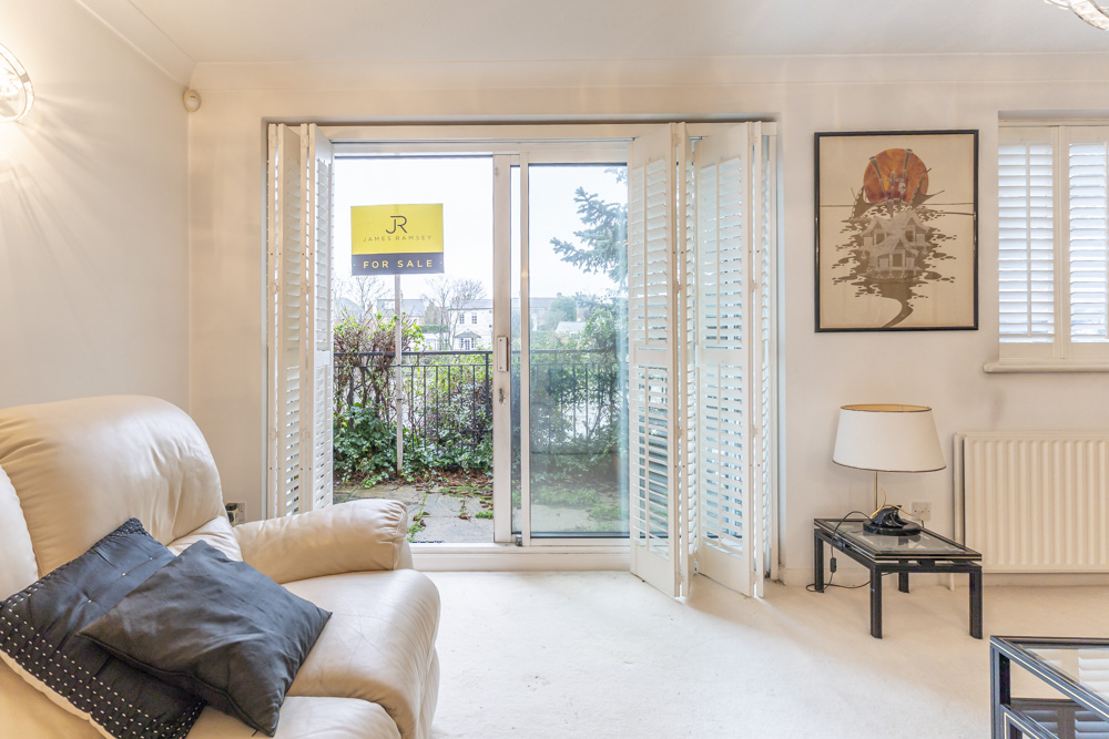 South facing living room with views over the Thames and access onto Thames side terrace via sliding doors.