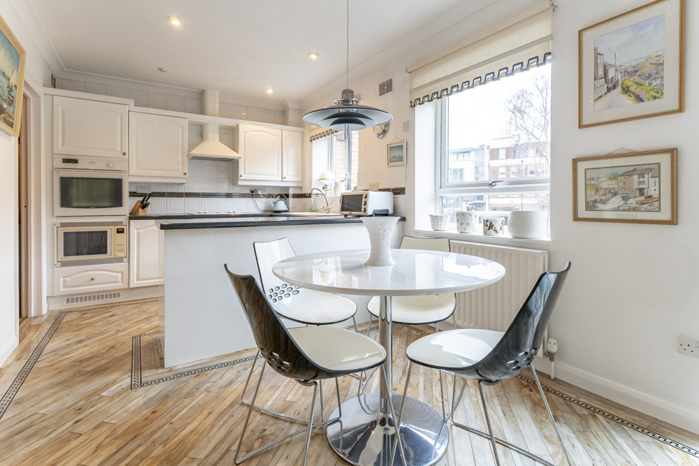 Fully fitted kitchen with integrated electric double oven and hob with extractor hood over. Space for fridge freezer, fitted automatic dishwasher. Dining area with windows to front.