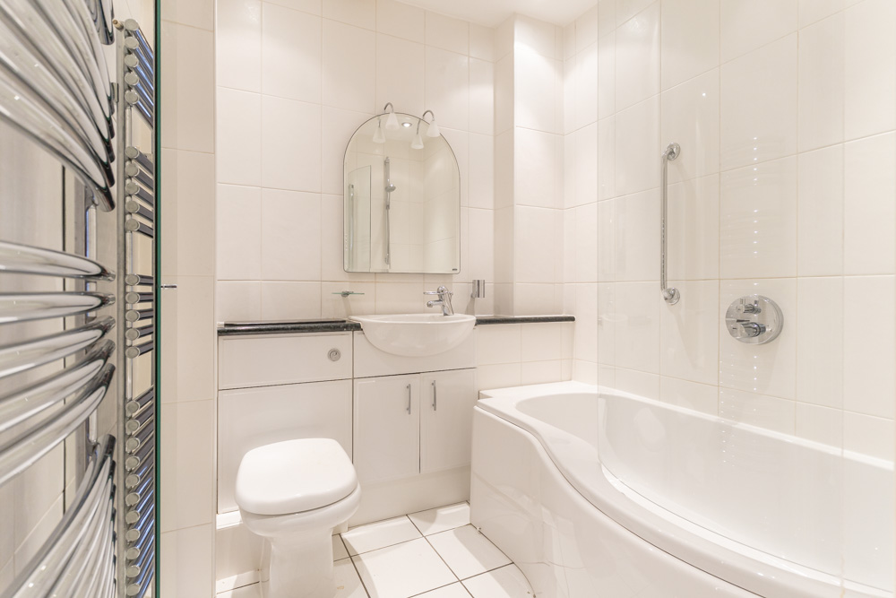 Modern bathroom with white suite comprising panel enclosed bath, low level WC and wash hand basin.