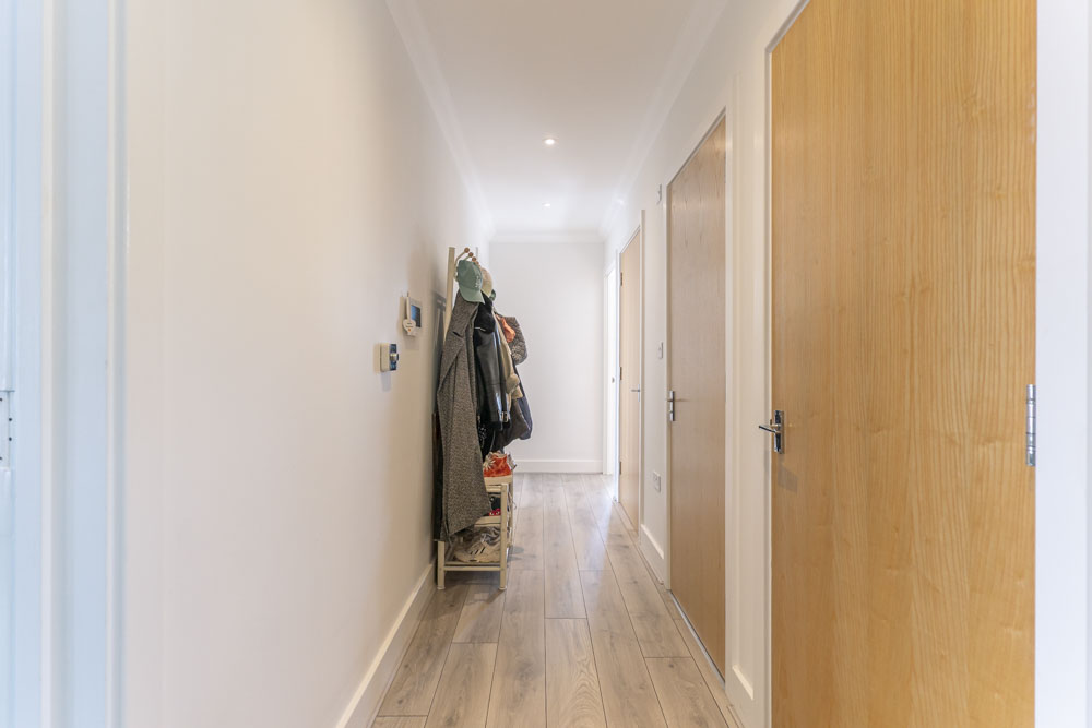 With sealed unit double glazed porthole window to side and radiator. Power points and built-in cloaks storage cupboard. Further cupboard housing hot water cylinder and further storage space. Wall mounted entry’phone handset. Wooden doors to all rooms.