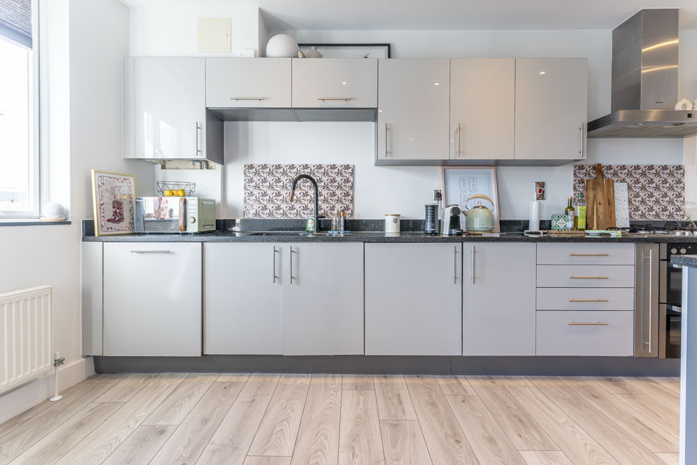 Bright living area with sealed unit double glazed casement doors and picture windows to terrace overlooking Thames. Feature panelled wall with TV point. Open plan to kitchen area with peninsular bar creating seating and workspace with storage below. Range of base and eye level units with granite work surface area with stainless steel sink inset with mixer tap, fitted electric double oven and gas hob with extractor hood over. Fitted concealed fridge and freezer, automatic washing machine and dishwasher.