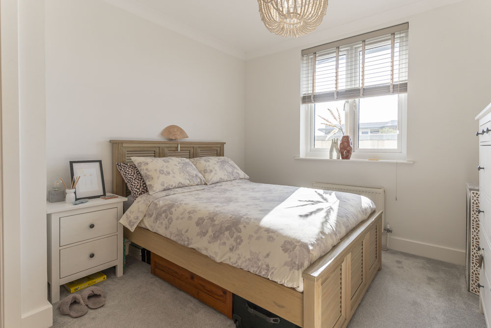 Rear aspect double bedroom with built in wardrobe with hanging and shelving space and wooden door.
