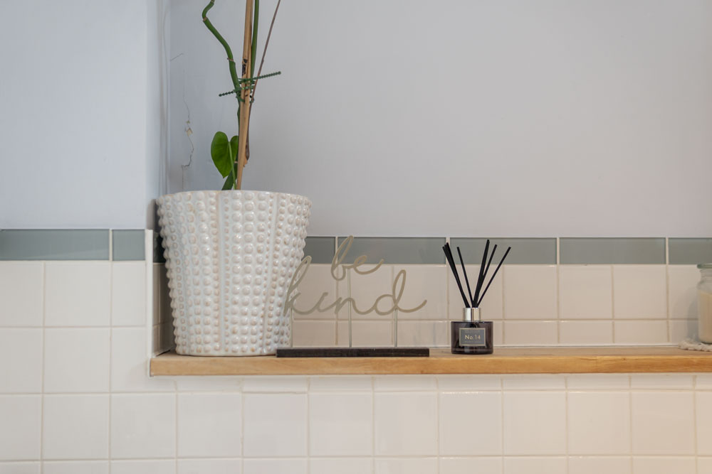 Modern white suite comprising panel enclosed bath with mixer tap and shower attachment, low level WC and vanity storage unit with wash hand basin and mixer tap over. Part tiled walls with sealed unit double glazed porthole window to side. Shaver point.