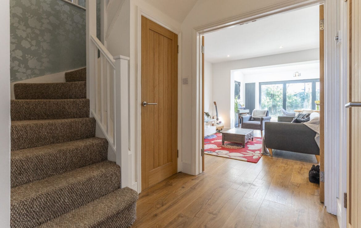 With radiator and power points and turning staircase to first floor with built in understair storage cupboard. Wooden flooring. Oak doors to all rooms.