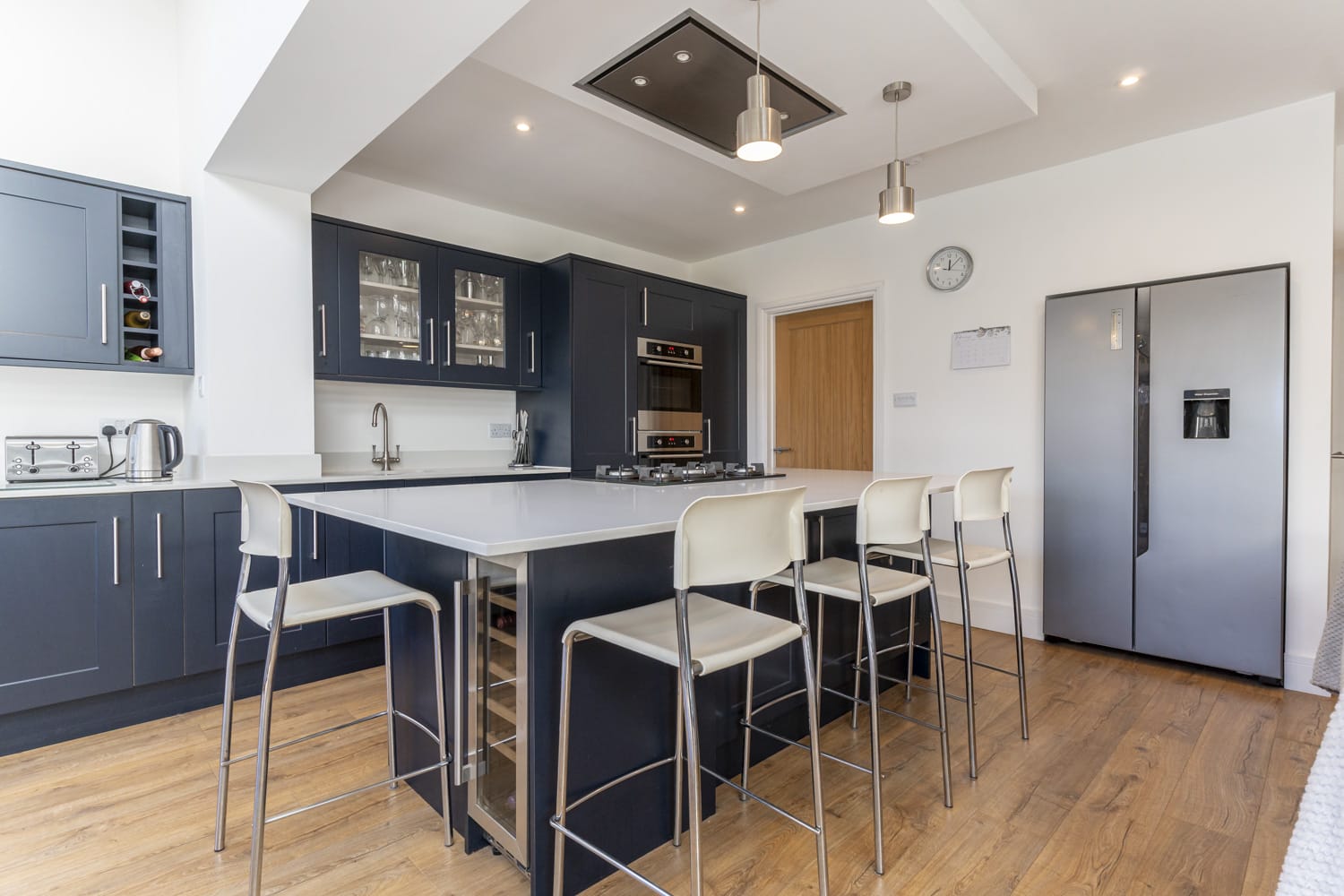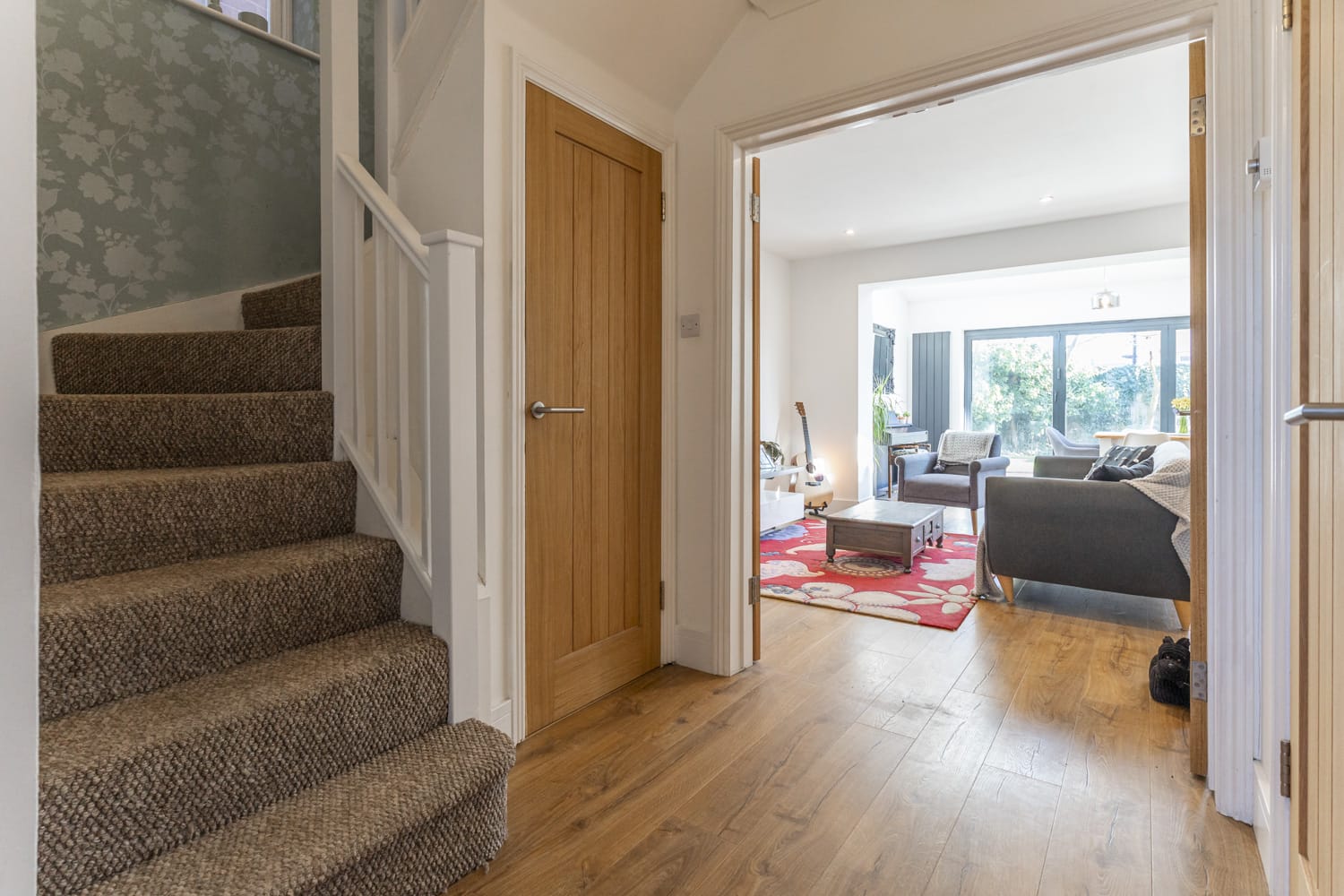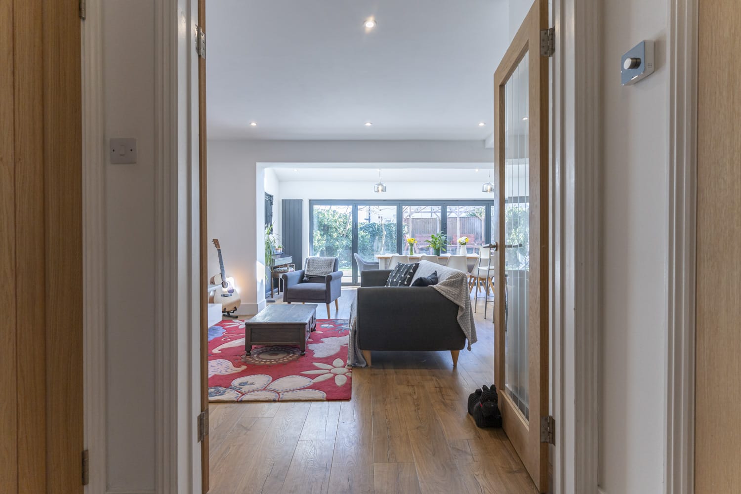 A stylish detached family house forming part of this small private gated development of five detached houses. The property has been extended to the rear to provide a bright open plan living area with stylish kitchen and bi-folding doors to the garden.