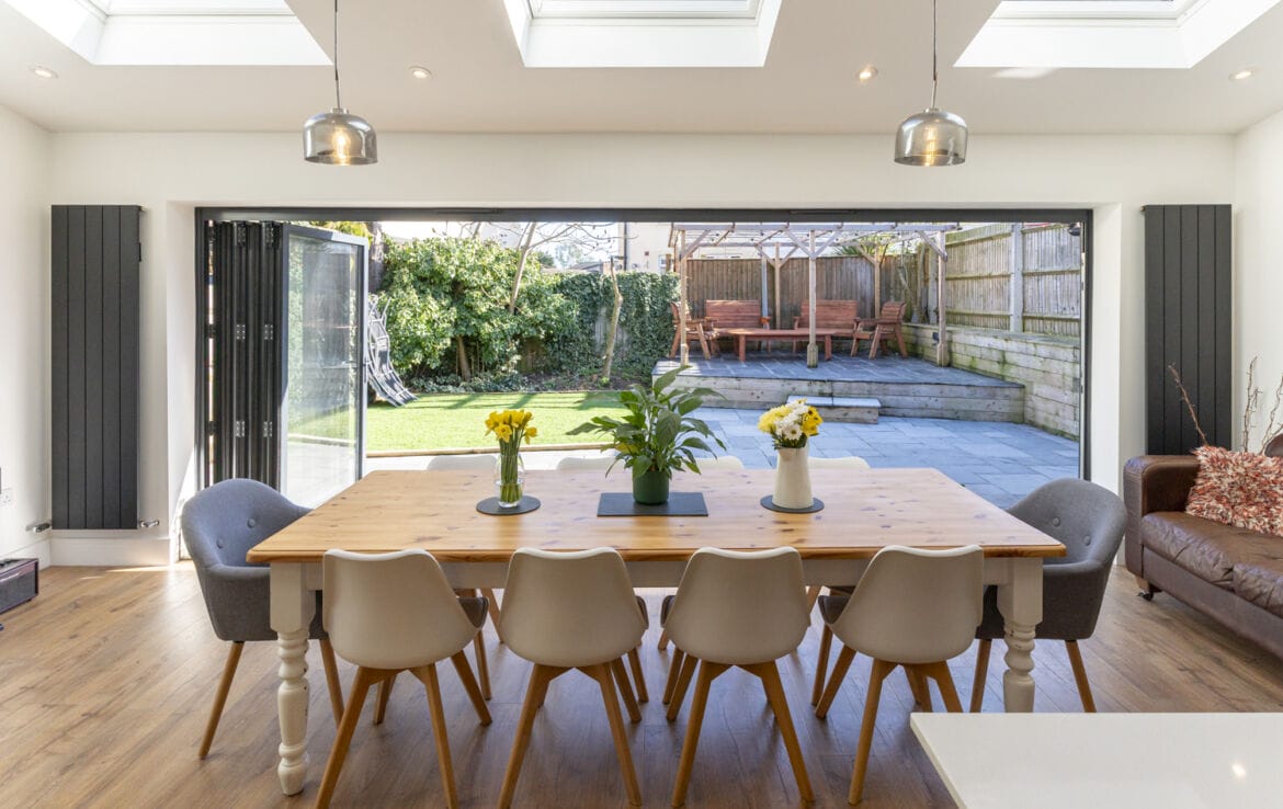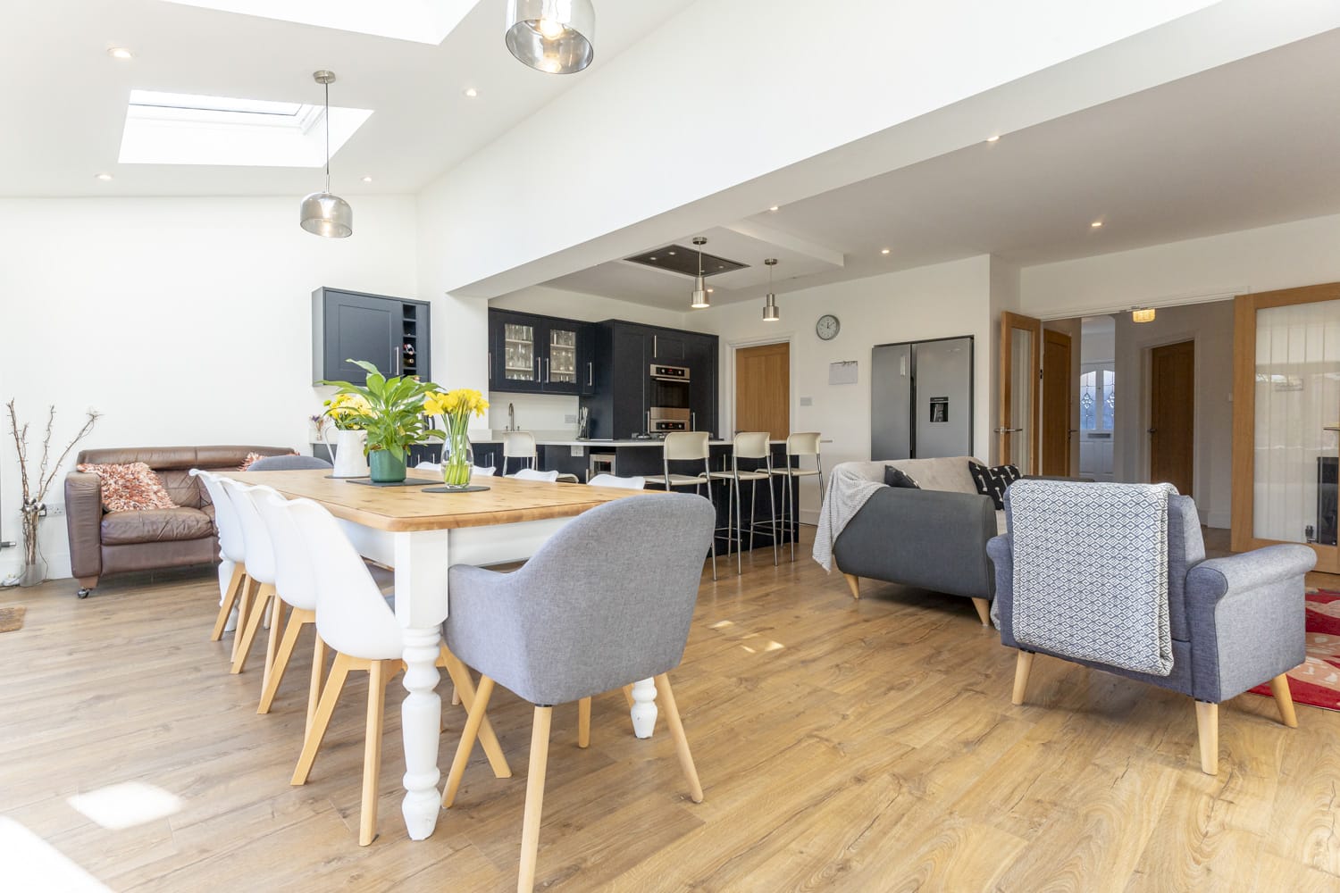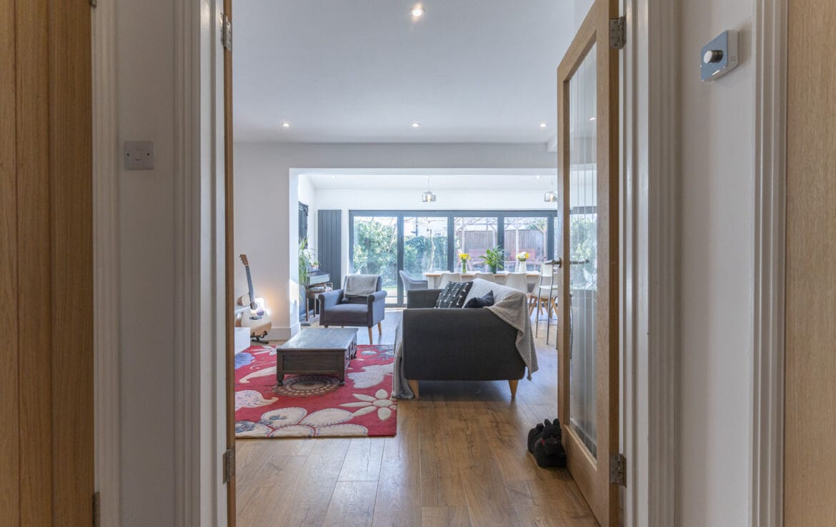 Open plan living space with oak flooring, sealed unit double glazed bi-folding doors to garden and part vaulted ceiling with skylight windows. TV point, power points, radiators. Stylish kitchen area with range of base and eye level units with granite work surface and inset sink with upboards under, fitted electric double oven. Fitted concealed dishwasher. Island units with granite surface and five ring gas cooktop with extractor over, wine fridge and eating area. Space for fridge freezer. Oak door to: