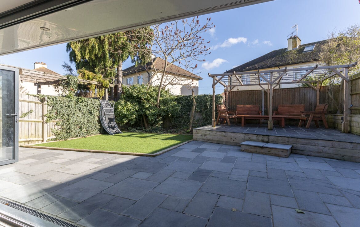 Stone paved patio area with outside lighting and access to front garden via side passage, steps up to raised paved seating area under pergola with outside power and timber edging. Fully enclosed by wooden panelled fencing.