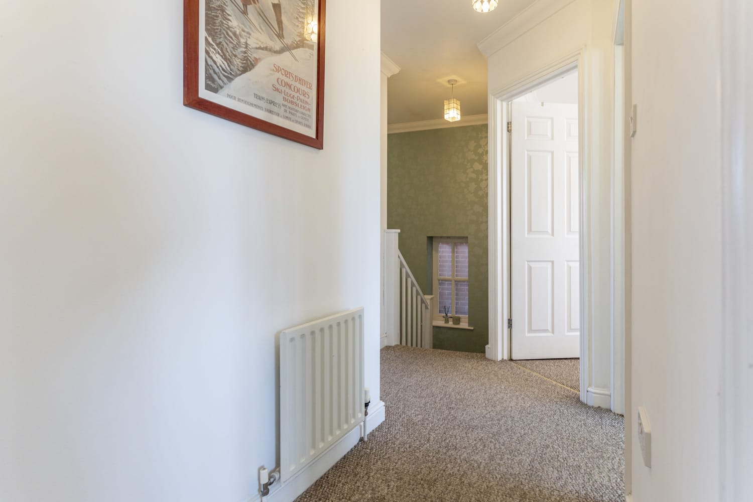 Turning Staircase from Entrance Hall to First Floor Landing with built in cupboard housing hot water cylinder and shelving space. Radiator, power points. Georgian style panelled doors to all rooms.