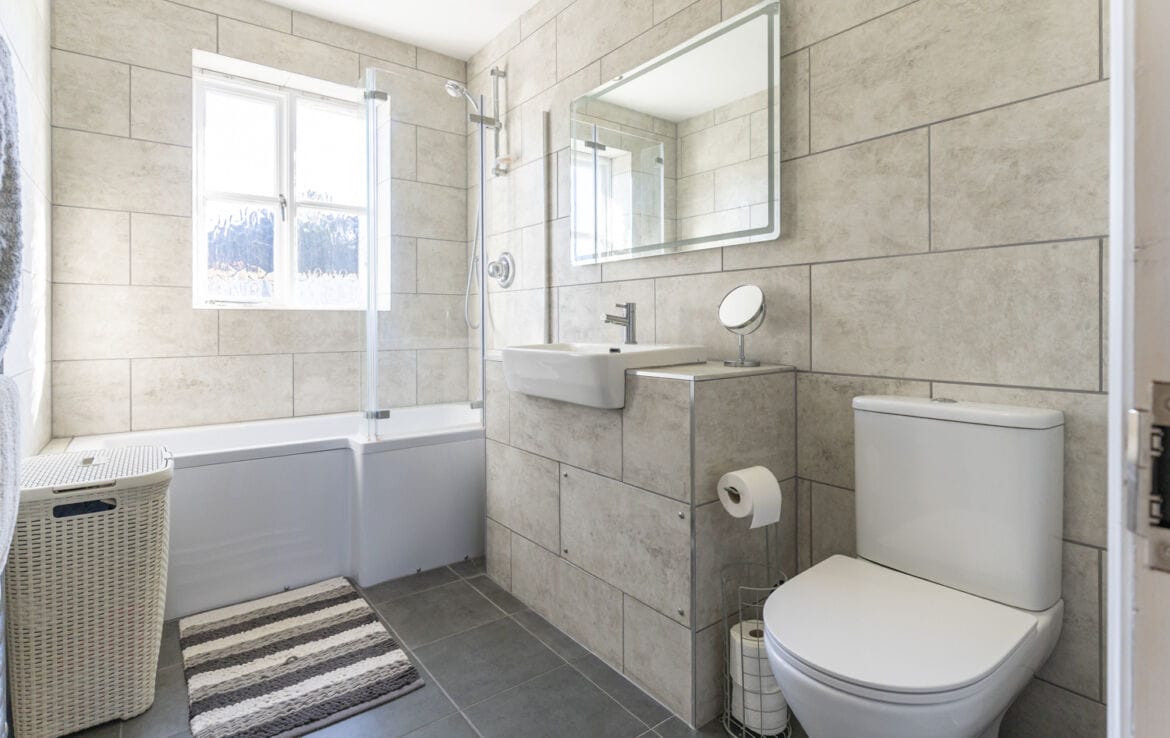 Modern white suite comprising panel enclosed shower bath with mixer tap, shower attachment and glass screen, low level WC and vanity unit with inset wash hand basin. Fully tiled walls with chrome ‘ladder’ style radiator and ceramic tiled floor.