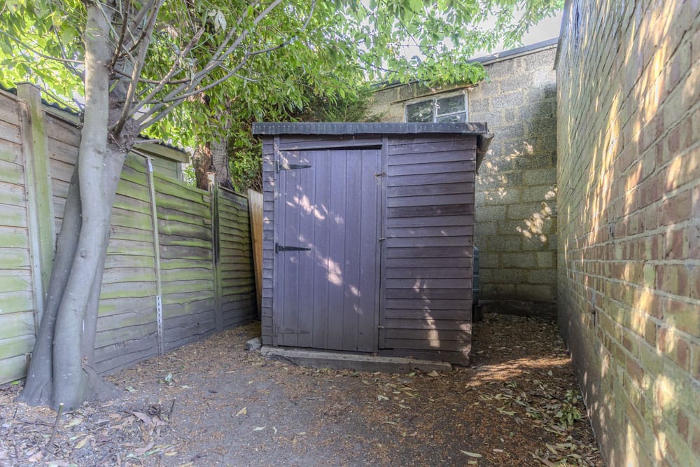 Fully enclosed rear garden laid to lawn with timber storage shed with pedestrian access to front garden via side passage.